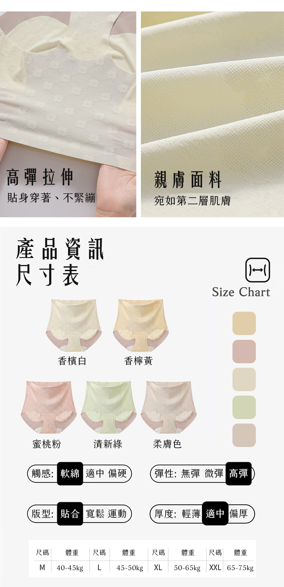 腰邊以舒適貼合為優先設計,收腹同時不壓迫;腿口採圓弧無痕熱切工法,彈性佳貼合大腿根部,走動、久坐都不會留下勒痕,穿洋裝或緊身褲更安心。