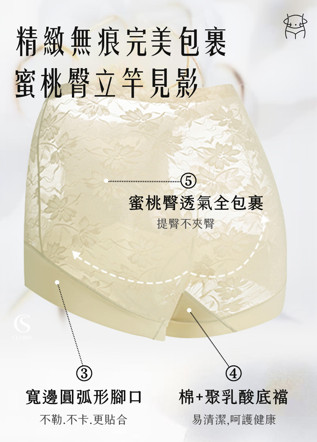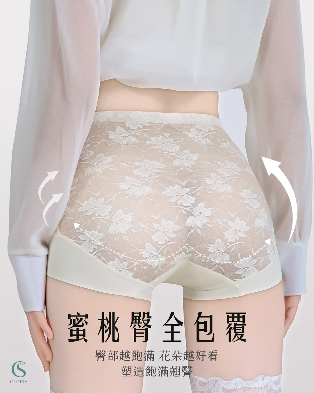 選用法式立體山茶花蕾絲,紋理精緻不刮膚,完整包覆臀型並優化線條,展現柔美又緊緻的蜜桃臀。