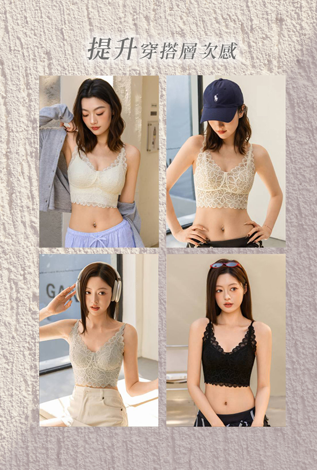 輕薄如肌膚的鏤空蕾絲V領Bra Top,以細膩鏤空與法式剪裁,溫柔包覆每一道曲線。自然貼合、不厚重,讓舒適與性感同時存在。無論日常或約會,都能在不經意之間,展現剛剛好的優雅與迷人。